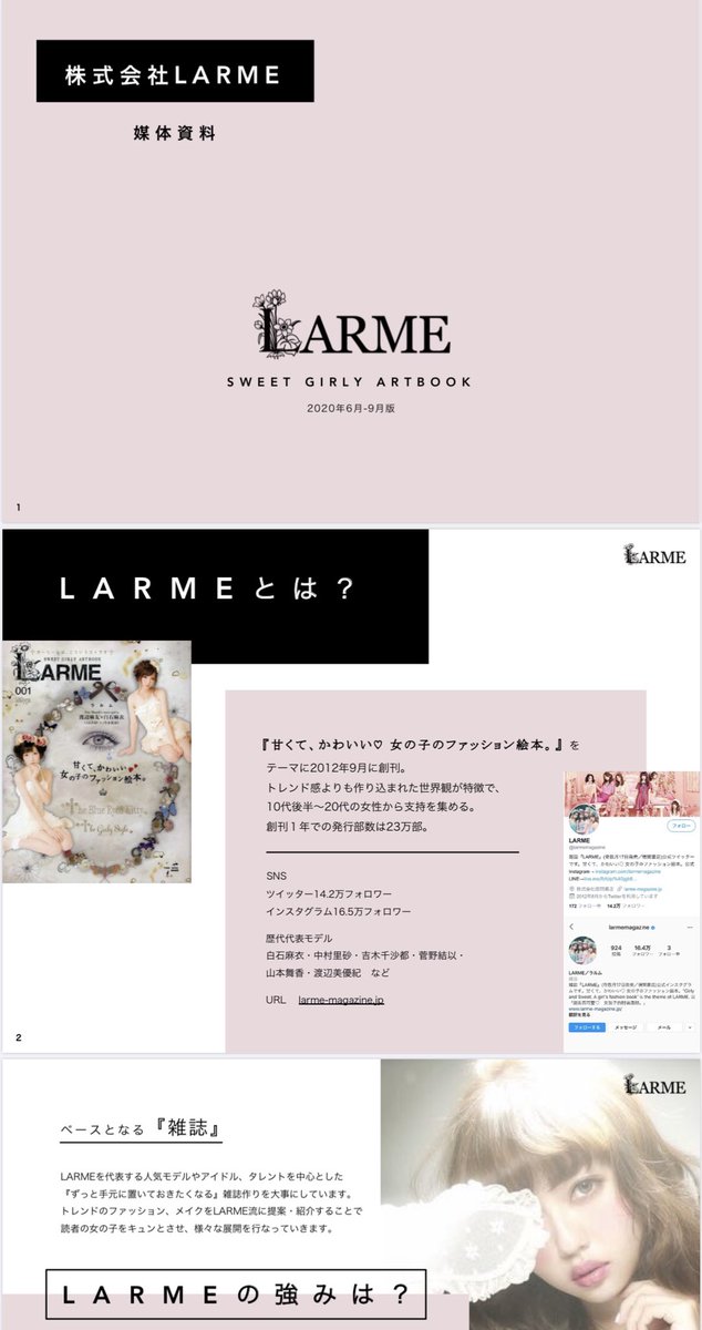 Larme 広告提案用の企画書5時間かけて作り終えたぞい こんな感じの媒体資料です かわいく作れたので ゆくゆくはサイトから見られるようにしたいなって思ってます 明日は朝から撮影だ 雨 心配だなぁ