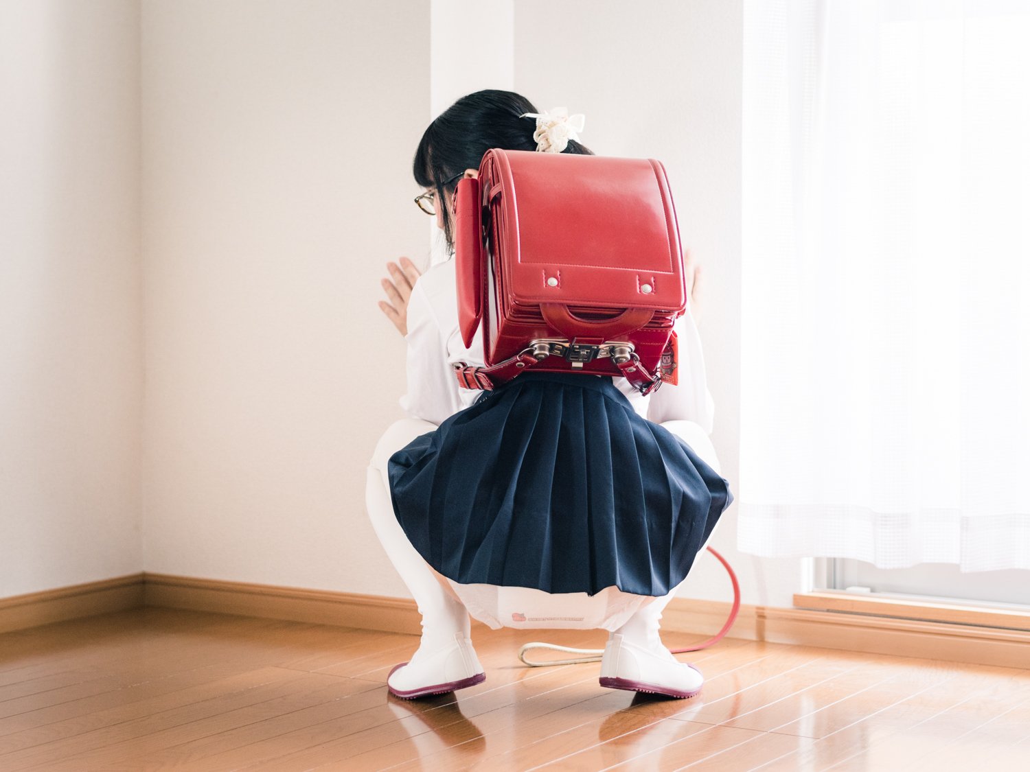 すちうる A Twitter 紙おむつが丸見えになるほどの丈の制服ミニスカートに白オーバーニーソックスを履いている赤ランドセルを背負った女子小学生のかっこうをしている黒髪地毛のぼくです