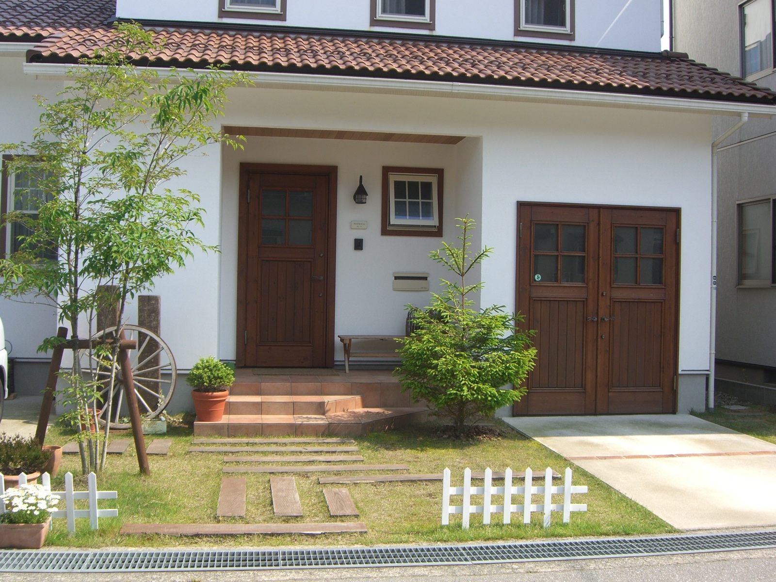 玄関アプローチを枕木とレンガの敷石でナチュラルテイストに 外構 お庭の施工事例 外構 お庭づくり ミドラス Midolas