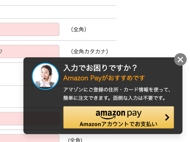 情報入力中にポップアップ表示 amazon payにweb接客機能 通販通信ecmo